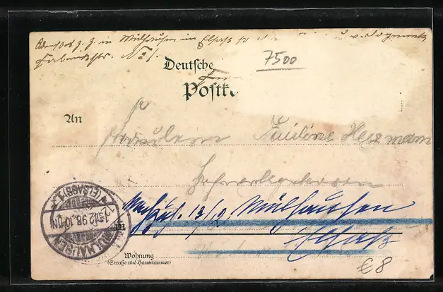 Personenbezogene Daten auf der Rückseite der Karte wurden durch blauen Textmarker unkenntlich gemacht. Die blauen Stellen sind auf die Vorderseite durchgeweicht und wirken sich negativ auf das Postkartenfoto aus