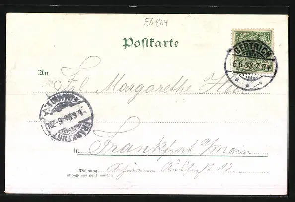 Personenbezogene Daten auf der Rückseite der Karte wurden durch blauen Textmarker unkenntlich gemacht. Die blauen Stellen sind auf die Vorderseite durchgeweicht und wirken sich negativ auf das Postkartenfoto aus
