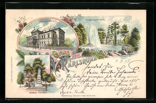 Lithographie Karlsruhe, Schlossgartensee, Generalcommando, Krieger-Denkmal