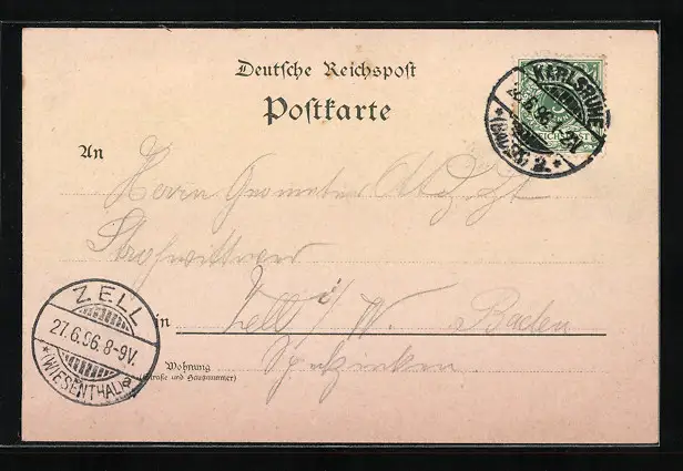 Personenbezogene Daten auf der Rückseite der Karte wurden durch blauen Textmarker unkenntlich gemacht. Die blauen Stellen sind auf die Vorderseite durchgeweicht und wirken sich negativ auf das Postkartenfoto aus