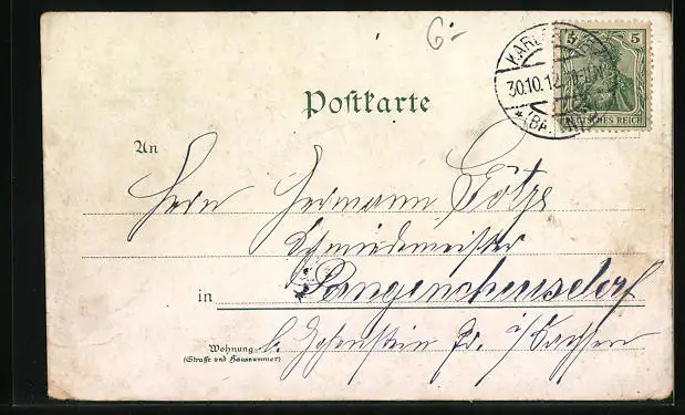 Personenbezogene Daten auf der Rückseite der Karte wurden durch blauen Textmarker unkenntlich gemacht. Die blauen Stellen sind auf die Vorderseite durchgeweicht und wirken sich negativ auf das Postkartenfoto aus