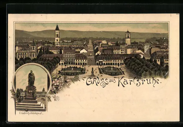 Lithographie Karlsruhe, Teilansicht mit Schloss, Friedrichsdenkmal