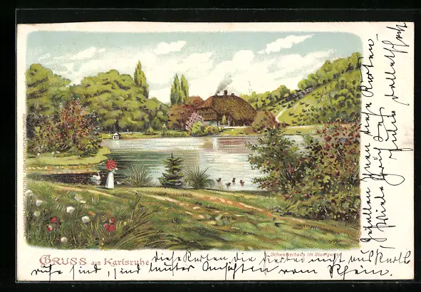 Lithographie Karlsruhe i. B., Schweizerhaus im Stadtgarten