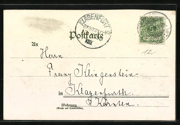 Personenbezogene Daten auf der Rückseite der Karte wurden durch blauen Textmarker unkenntlich gemacht. Die blauen Stellen sind auf die Vorderseite durchgeweicht und wirken sich negativ auf das Postkartenfoto aus