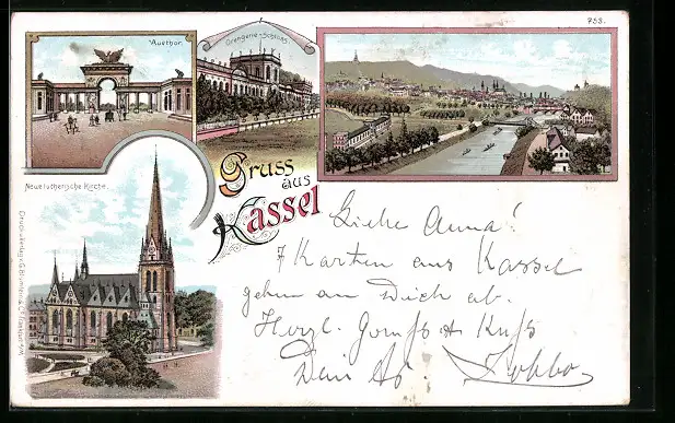Lithographie Kassel, Auethor, Orangerie-Schloss, neue luth. Kirche