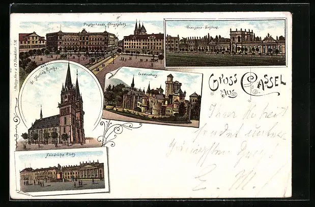 Lithographie Kassel, Löwenburg, St. Martins-Kirche, Friedrichsplatz