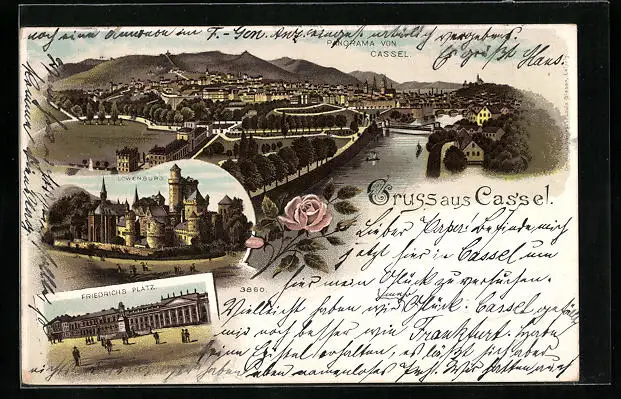Lithographie Kassel, Panorama, Löwenburg, Friedrichsplatz