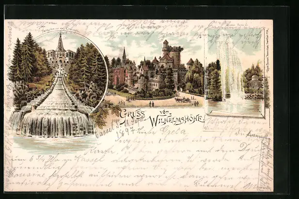 Lithographie Kassel-Wilhelmshöhe, Hercules mit den Cascaden, Löwenburg