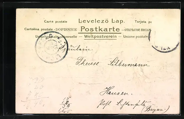 Personenbezogene Daten auf der Rückseite der Karte wurden durch blauen Textmarker unkenntlich gemacht. Die blauen Stellen sind auf die Vorderseite durchgeweicht und wirken sich negativ auf das Postkartenfoto aus