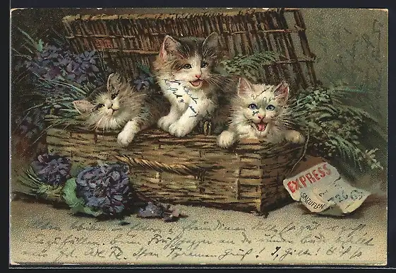 Lithographie Katzenkinder in Korb