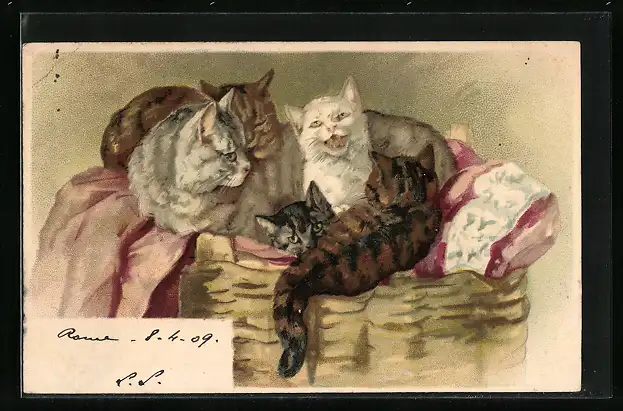 Lithographie Katzenmutter mit Jungen auf einem Wäschekorb