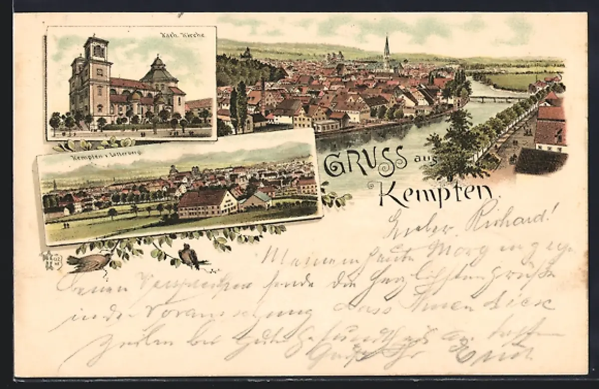 Lithographie Kempten / Allgäu, Kath. Kirche, Gesamtansicht