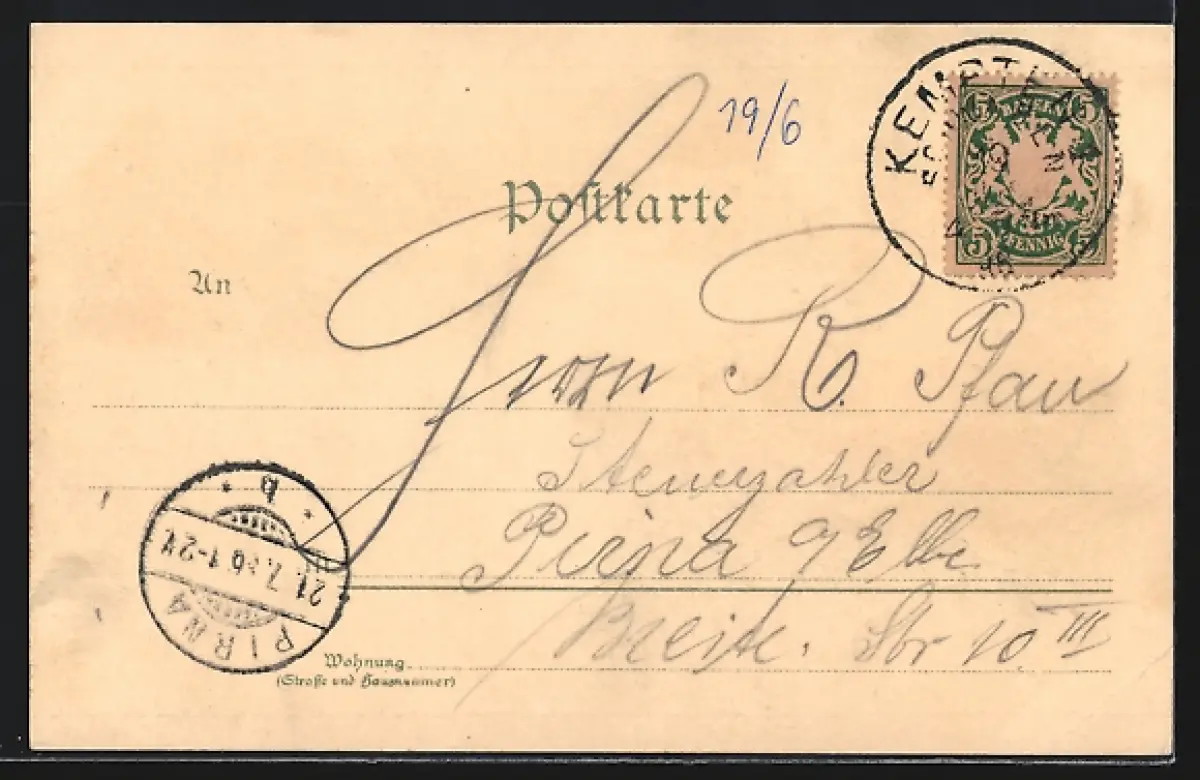 Personenbezogene Daten auf der Rückseite der Karte wurden durch blauen Textmarker unkenntlich gemacht. Die blauen Stellen sind auf die Vorderseite durchgeweicht und wirken sich negativ auf das Postkartenfoto aus