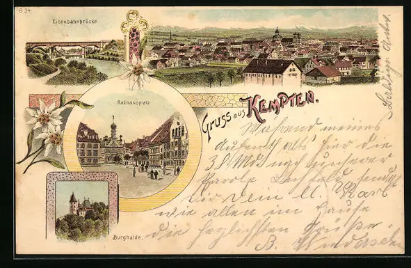 Lithographie Kempten, Burghalde, Eisenbahnbrücke, Rathausplatz