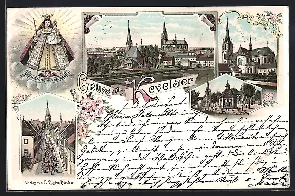 Lithographie Kevelaer, Kirche, Prozession und Teilansichten