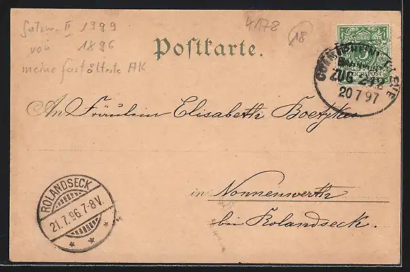 gelaufen 1896, Eckknick oben li., guter Zustand