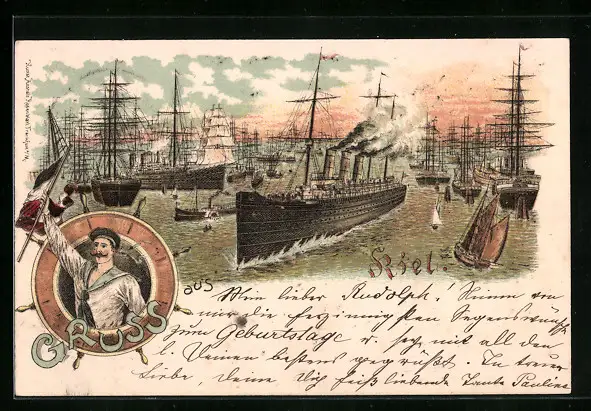 Lithographie Kiel, Dampfer auf Gewässer