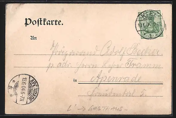 Personenbezogene Daten auf der Rückseite der Karte wurden durch blauen Textmarker unkenntlich gemacht. Die blauen Stellen sind auf die Vorderseite durchgeweicht und wirken sich negativ auf das Postkartenfoto aus