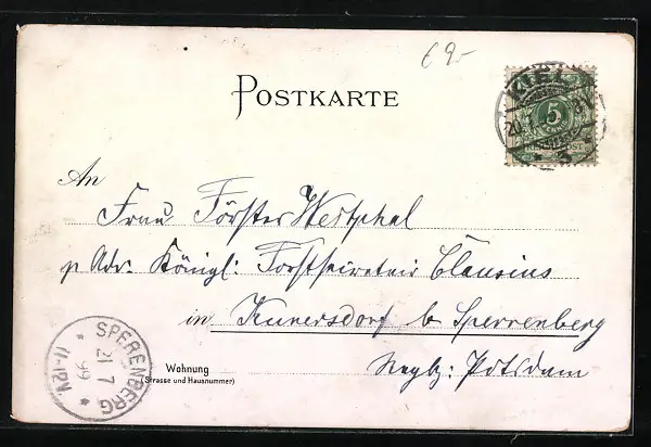 Personenbezogene Daten auf der Rückseite der Karte wurden durch blauen Textmarker unkenntlich gemacht. Die blauen Stellen sind auf die Vorderseite durchgeweicht und wirken sich negativ auf das Postkartenfoto aus