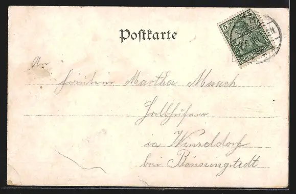 Personenbezogene Daten auf der Rückseite der Karte wurden durch blauen Textmarker unkenntlich gemacht. Die blauen Stellen sind auf die Vorderseite durchgeweicht und wirken sich negativ auf das Postkartenfoto aus
