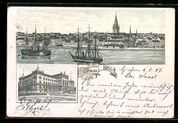 Lithographie Kiel, Marine Academie, Ortsansicht mit Schiffen