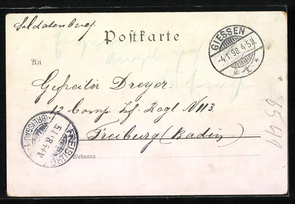 Personenbezogene Daten auf der Rückseite der Karte wurden durch blauen Textmarker unkenntlich gemacht. Die blauen Stellen sind auf die Vorderseite durchgeweicht und wirken sich negativ auf das Postkartenfoto aus