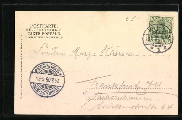 Personenbezogene Daten auf der Rückseite der Karte wurden durch blauen Textmarker unkenntlich gemacht. Die blauen Stellen sind auf die Vorderseite durchgeweicht und wirken sich negativ auf das Postkartenfoto aus