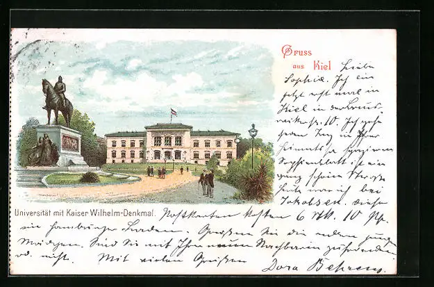 Lithographie Kiel, Universität mit Kaiser Wilhelm-Denkmal