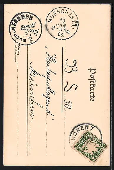 Personenbezogene Daten auf der Rückseite der Karte wurden durch blauen Textmarker unkenntlich gemacht. Die blauen Stellen sind auf die Vorderseite durchgeweicht und wirken sich negativ auf das Postkartenfoto aus