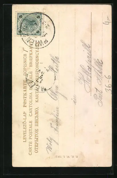 Personenbezogene Daten auf der Rückseite der Karte wurden durch blauen Textmarker unkenntlich gemacht. Die blauen Stellen sind auf die Vorderseite durchgeweicht und wirken sich negativ auf das Postkartenfoto aus