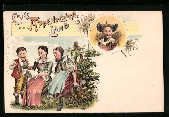 Lithographie Kinder aus dem Appenzeller Land in Trachten