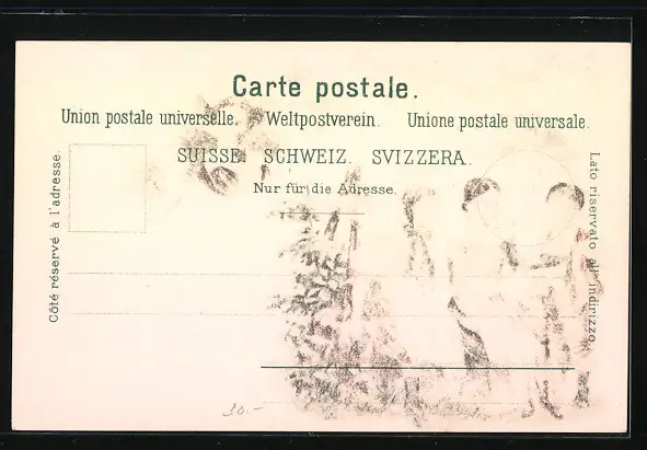 Personenbezogene Daten auf der Rückseite der Karte wurden durch blauen Textmarker unkenntlich gemacht. Die blauen Stellen sind auf die Vorderseite durchgeweicht und wirken sich negativ auf das Postkartenfoto aus