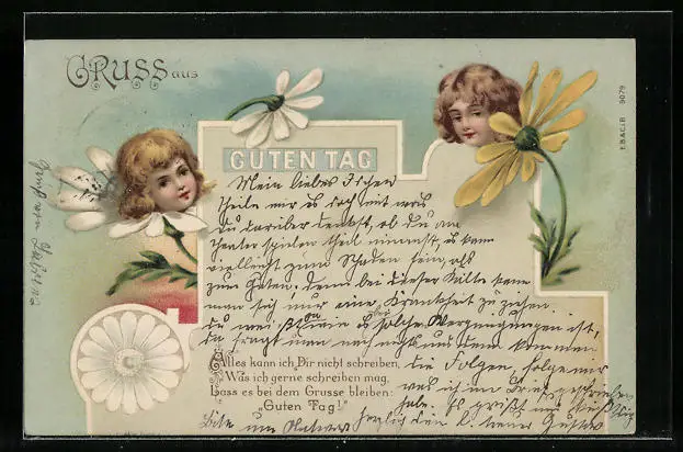 Lithographie Kindergesichter in Blüten wünschen Guten Tag