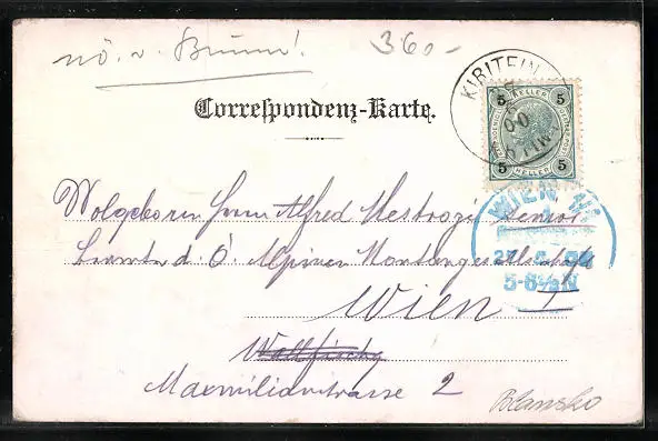 Personenbezogene Daten auf der Rückseite der Karte wurden durch blauen Textmarker unkenntlich gemacht. Die blauen Stellen sind auf die Vorderseite durchgeweicht und wirken sich negativ auf das Postkartenfoto aus