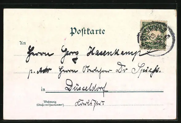 Personenbezogene Daten auf der Rückseite der Karte wurden durch blauen Textmarker unkenntlich gemacht. Die blauen Stellen sind auf die Vorderseite durchgeweicht und wirken sich negativ auf das Postkartenfoto aus
