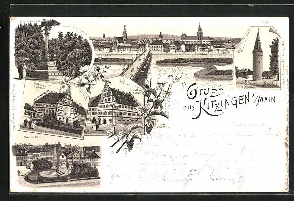 Lithographie Kitzingen am Main, Rathaus, Königsplatz, Falterturm