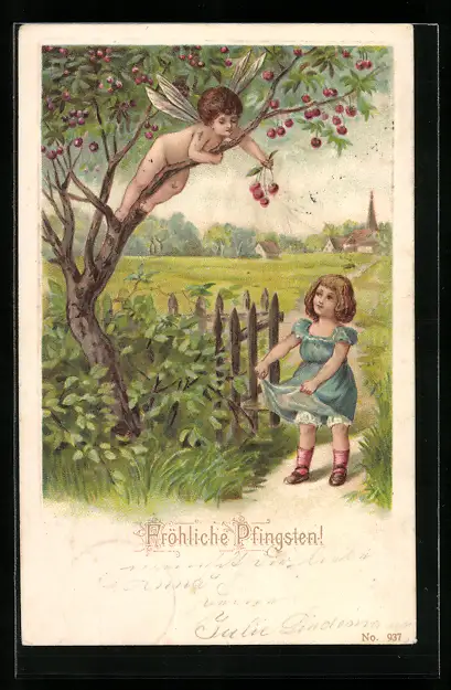 Lithographie Kleines Mädchen erhält Kirschen von einer Fee zu Pfingsten