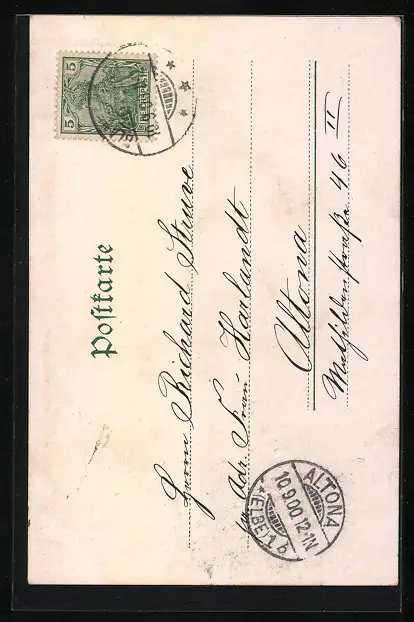 Personenbezogene Daten auf der Rückseite der Karte wurden durch blauen Textmarker unkenntlich gemacht. Die blauen Stellen sind auf die Vorderseite durchgeweicht und wirken sich negativ auf das Postkartenfoto aus