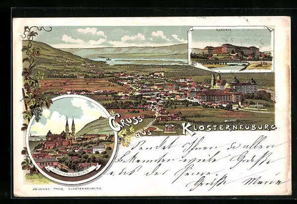 Lithographie Klosterneuburg, Gesamtansicht, Kaserne, Stiftskirche