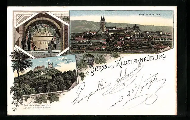 Lithographie Klosterneuburg, Ortsansicht mit Fassrutschen und Leopoldsberg