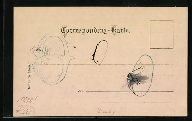 Personenbezogene Daten auf der Rückseite der Karte wurden durch blauen Textmarker unkenntlich gemacht. Die blauen Stellen sind auf die Vorderseite durchgeweicht und wirken sich negativ auf das Postkartenfoto aus