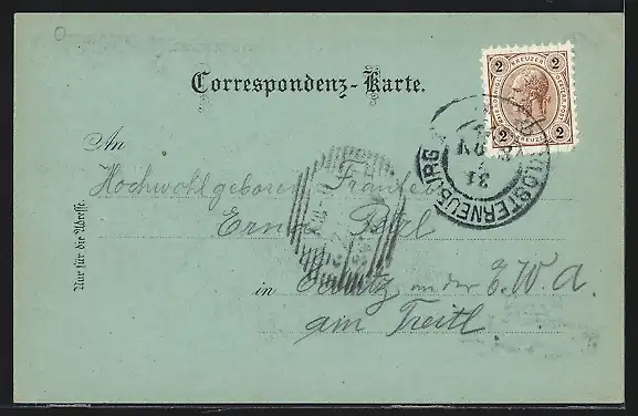 Personenbezogene Daten auf der Rückseite der Karte wurden durch blauen Textmarker unkenntlich gemacht. Die blauen Stellen sind auf die Vorderseite durchgeweicht und wirken sich negativ auf das Postkartenfoto aus