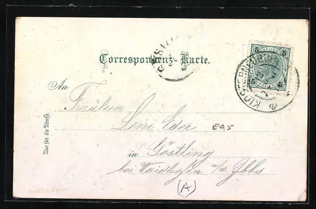 Personenbezogene Daten auf der Rückseite der Karte wurden durch blauen Textmarker unkenntlich gemacht. Die blauen Stellen sind auf die Vorderseite durchgeweicht und wirken sich negativ auf das Postkartenfoto aus