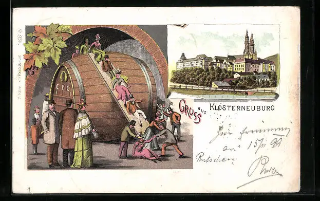 Lithographie Klosterneuburg, Teilansicht und Fassrutschen