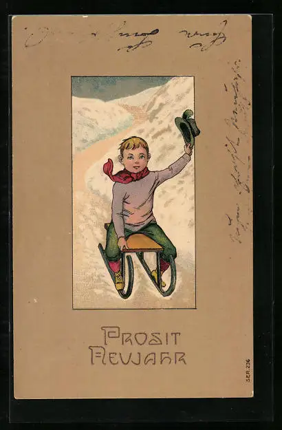 Lithographie Knabe auf Schlitten