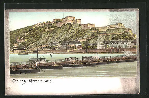 Lithographie Koblenz-Ehrenbreitstein, Teilansicht mit Booten