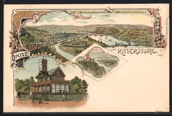 Lithographie Koblenz, Gesamtansicht mit Umgebung von oben, Gasthof Rittersturz