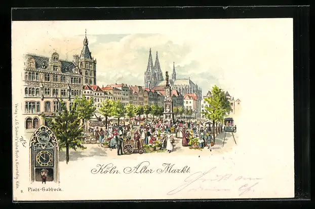 Lithographie Köln, Alter Markt mit Dom, Strassenbahn