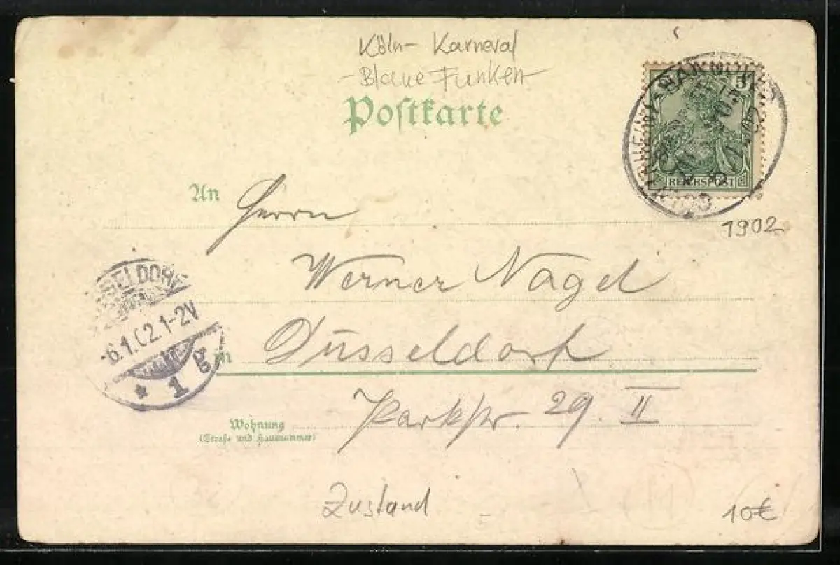 gelaufen 1902, Eckknicke li. unten und re. oben, Abriebspur re. oben, guter Zustand