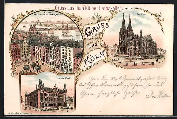 Lithographie Köln, Blick auf die feste Brücke, Dom, Haupt-Post